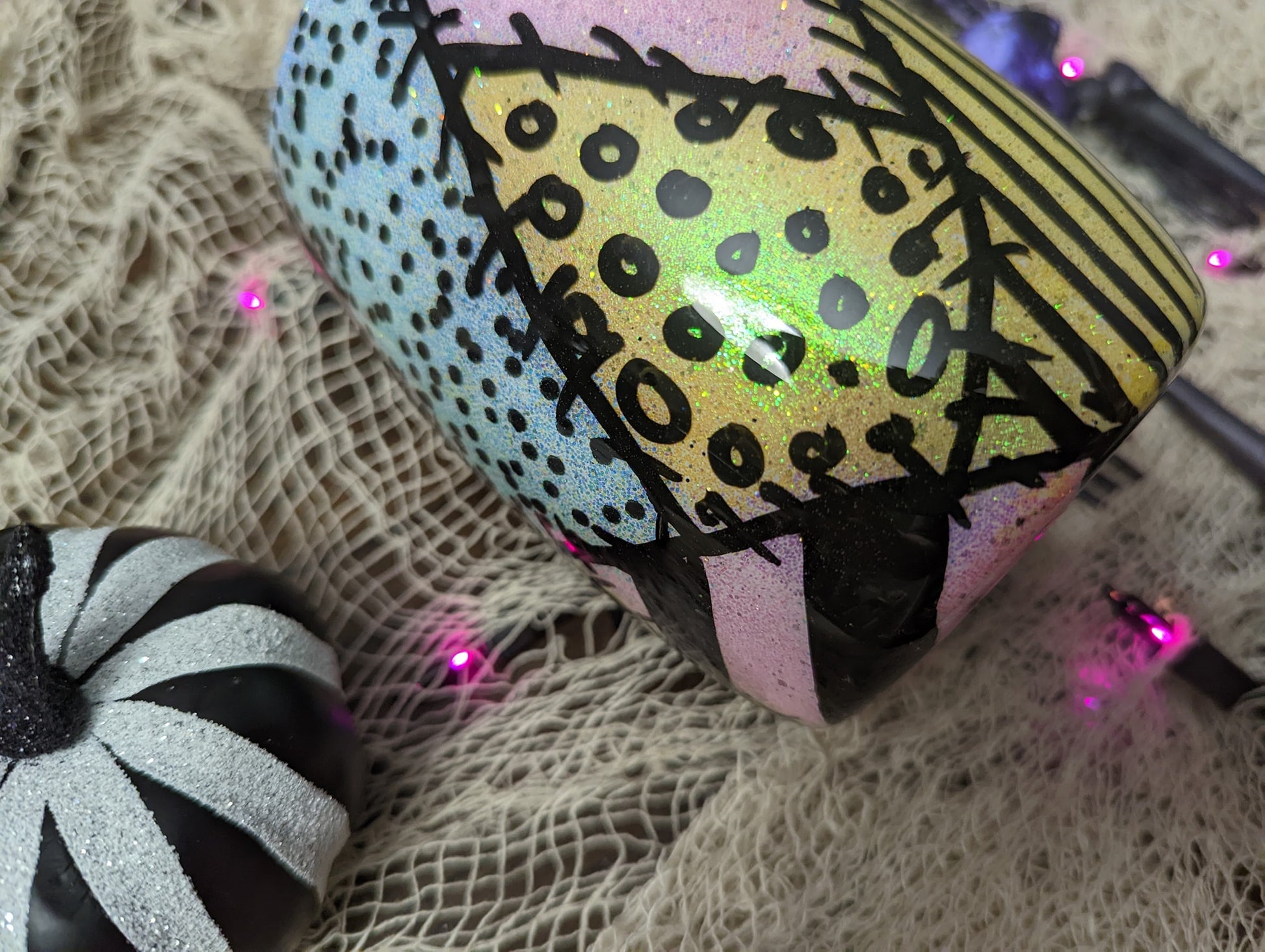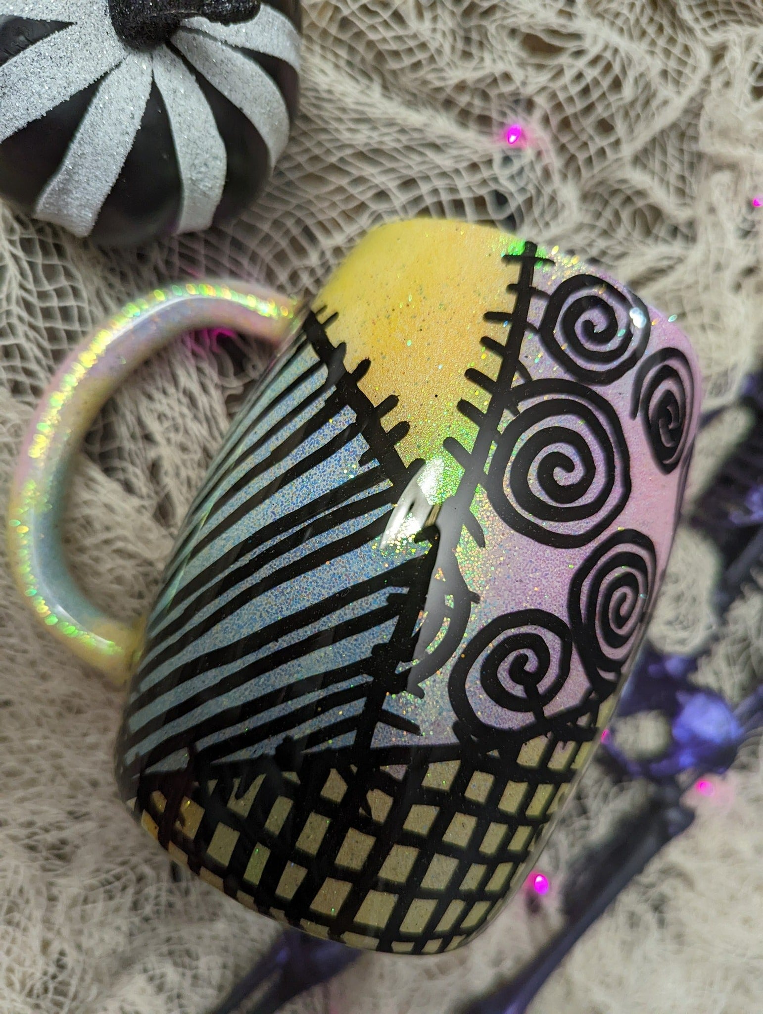 Sally mug is multicolored with "stitching" covering the entire mug.