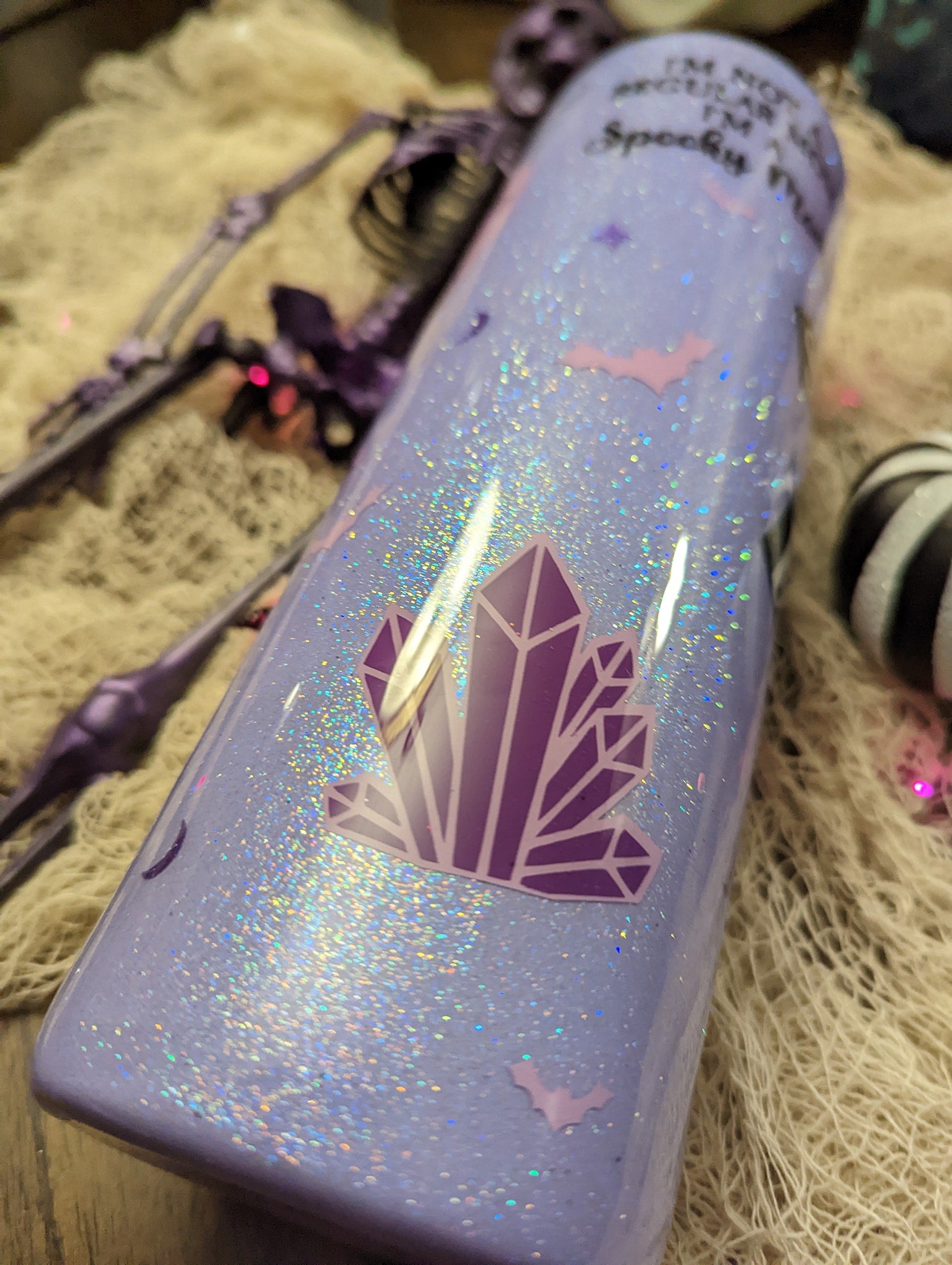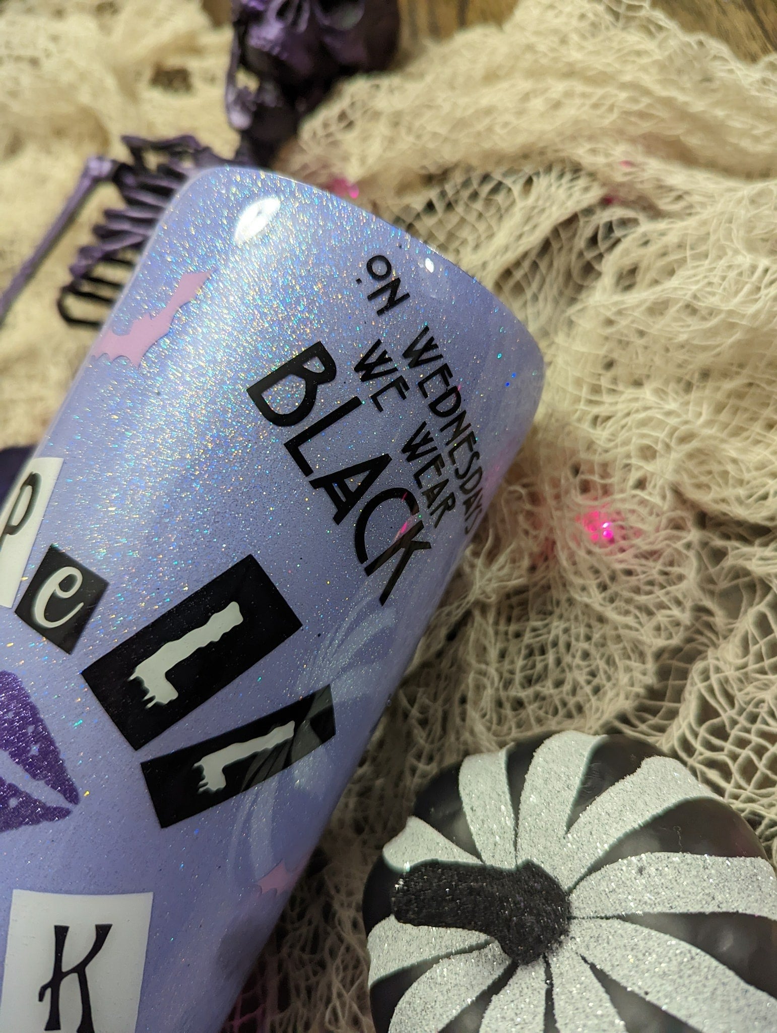 Light purple glitter base with miscellaneous quotes inspired by the movie "Mean Girls" main decal reads spell book, all other quotes are plays on words and turned spooky!