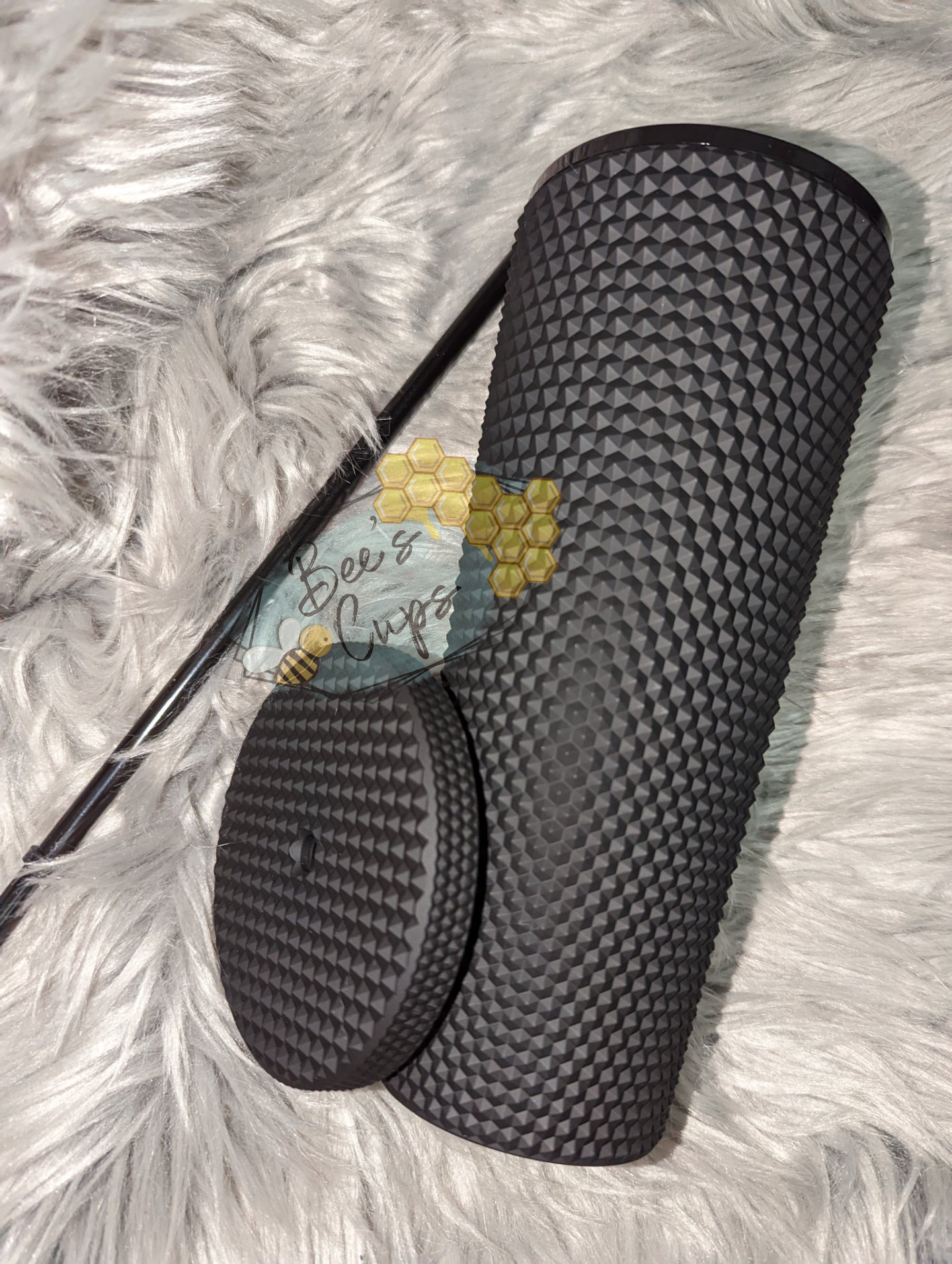 Black studded tumbler is matte black all around, including the lid and comes with a black straw with a built in stopper.