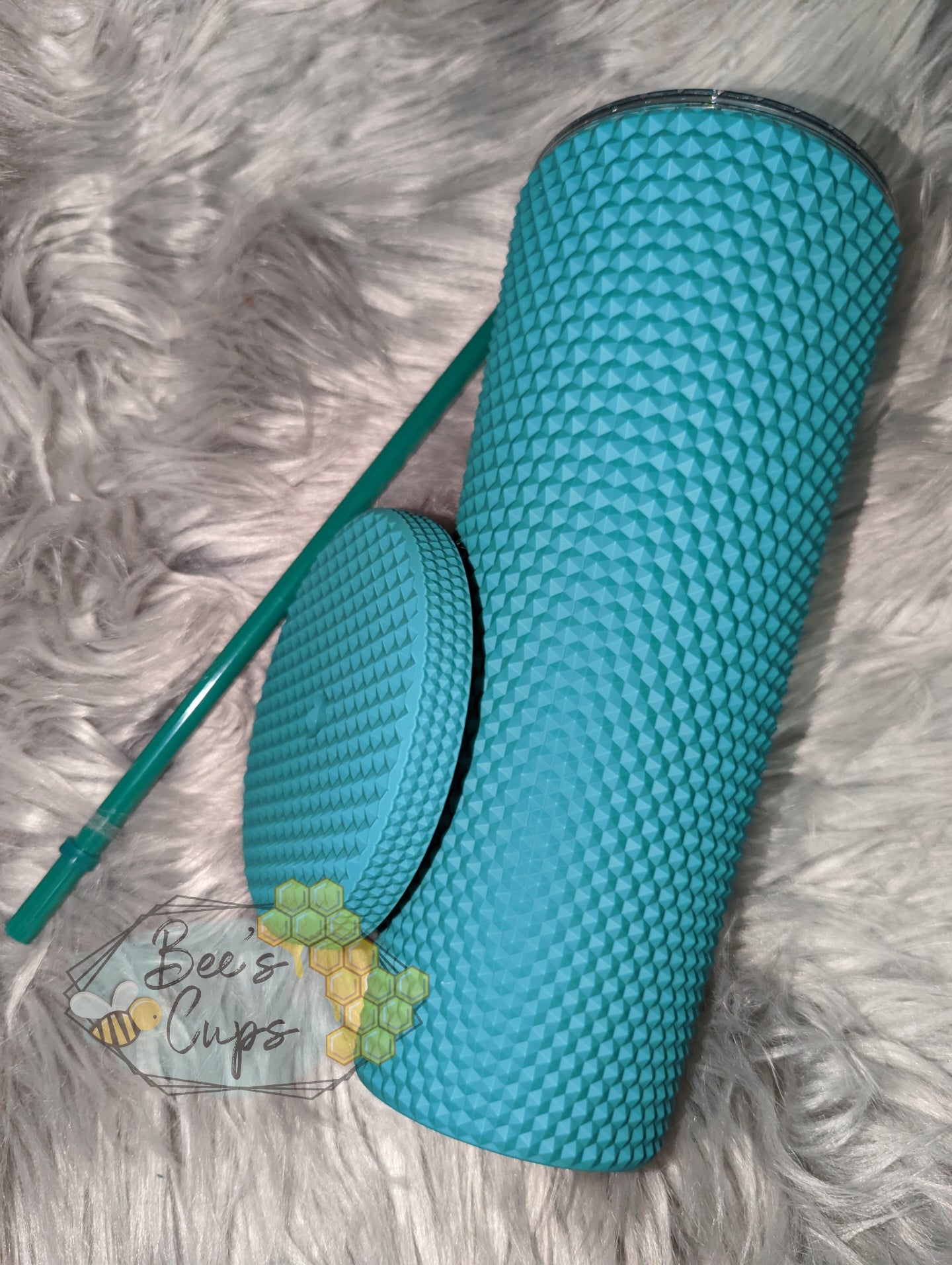Green studded tumbler is matte green all around, including the lid and comes with a green straw with a built in stopper.