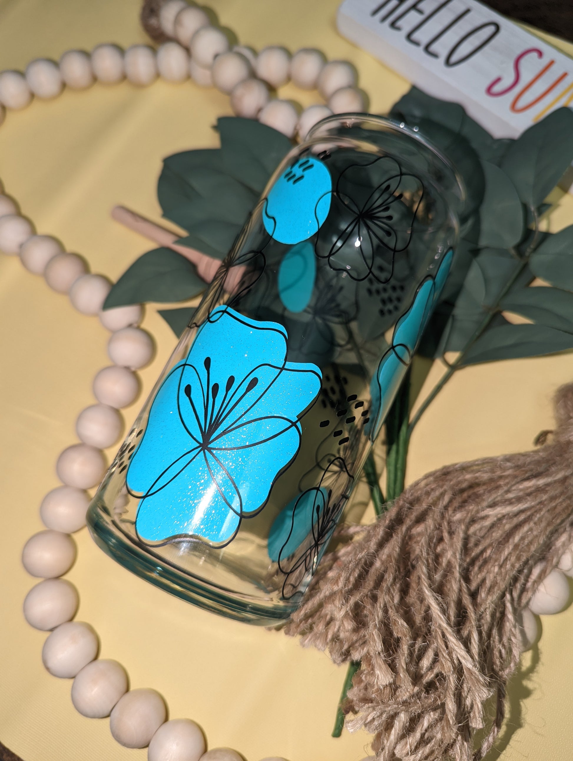 20 oz glass can comes with or without a bamboo lid and 2 glass straws. Completed with black and blue glitter vinyls.