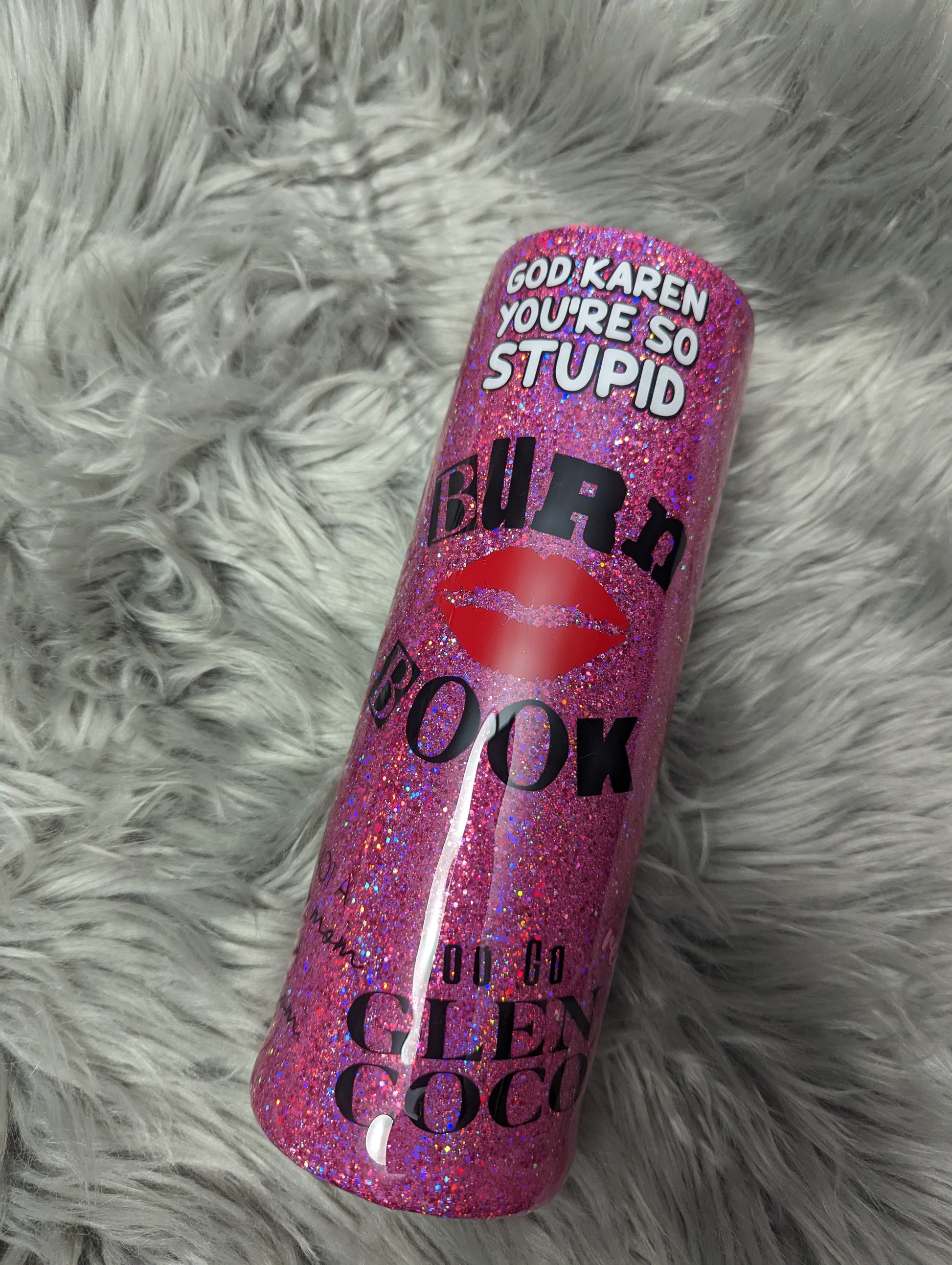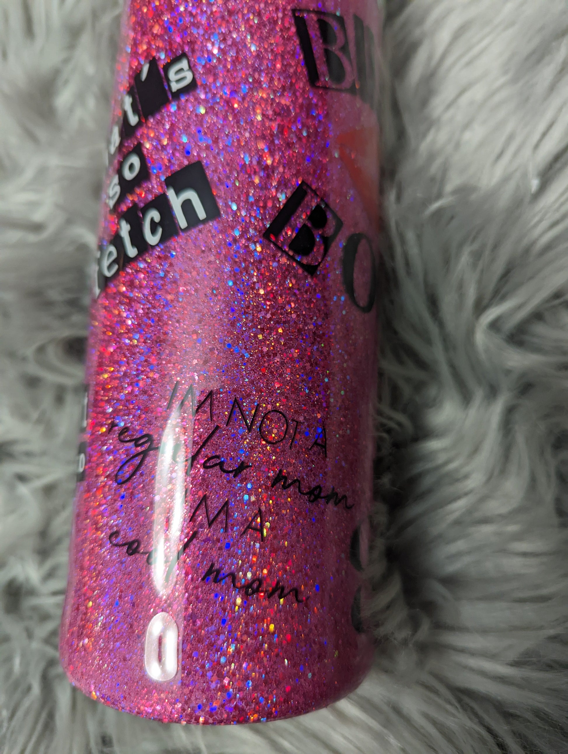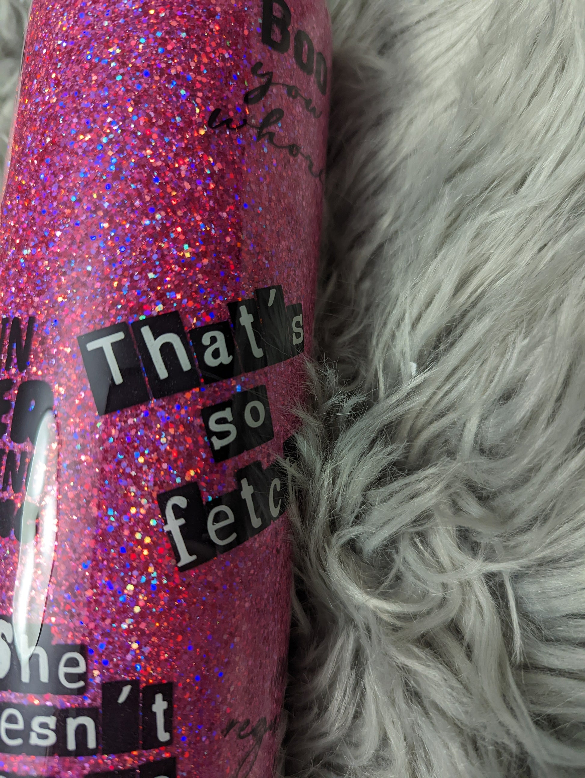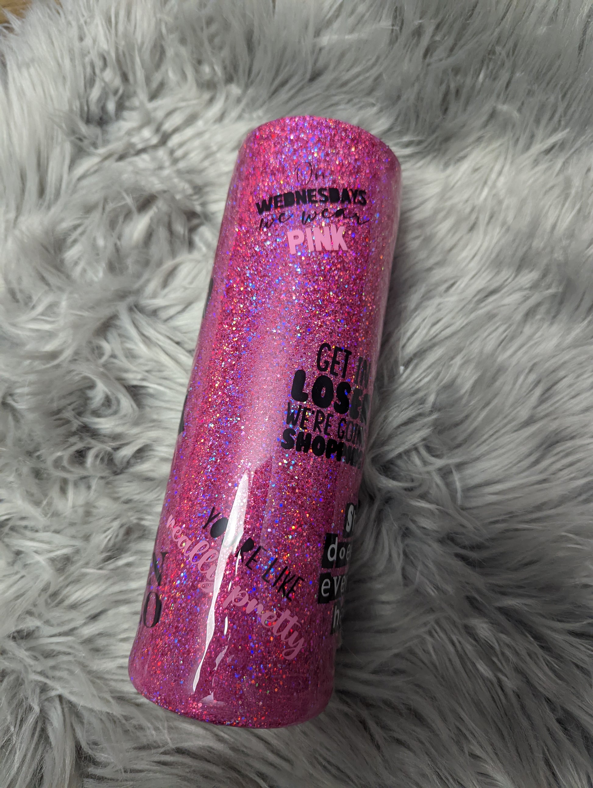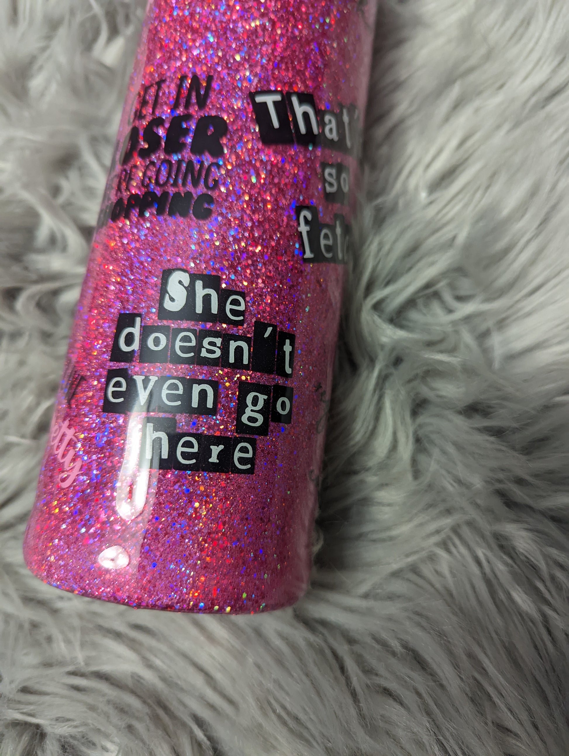 Hot pink glitter base with miscellaneous quotes inspired by the movie "Mean Girls" main decal reads burn book