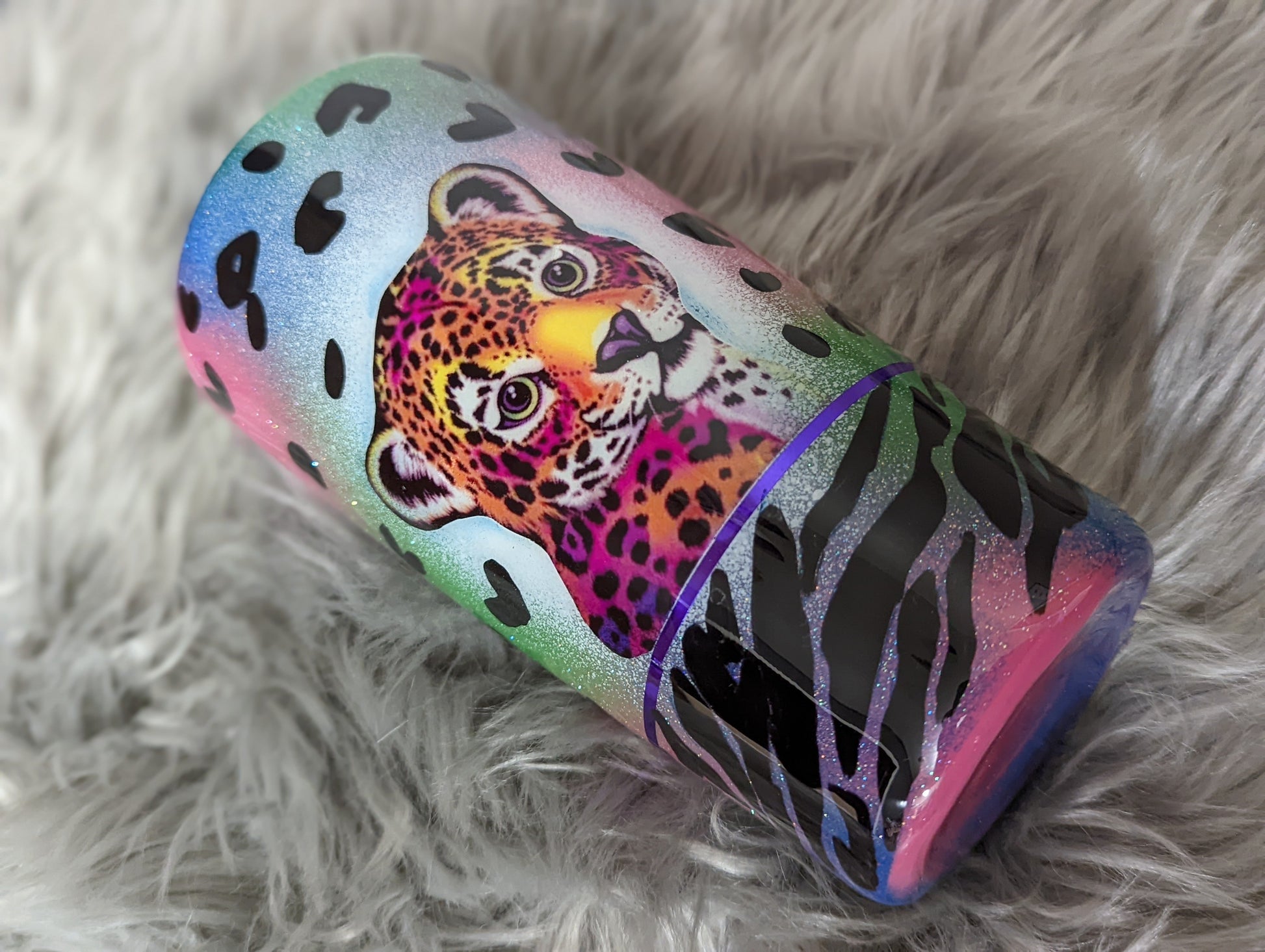 Design completed with multicolored glitter base, white "bleach" burst in the middle with multicolored leopard face, black leopard spots on top and black zebra stripes on bottom