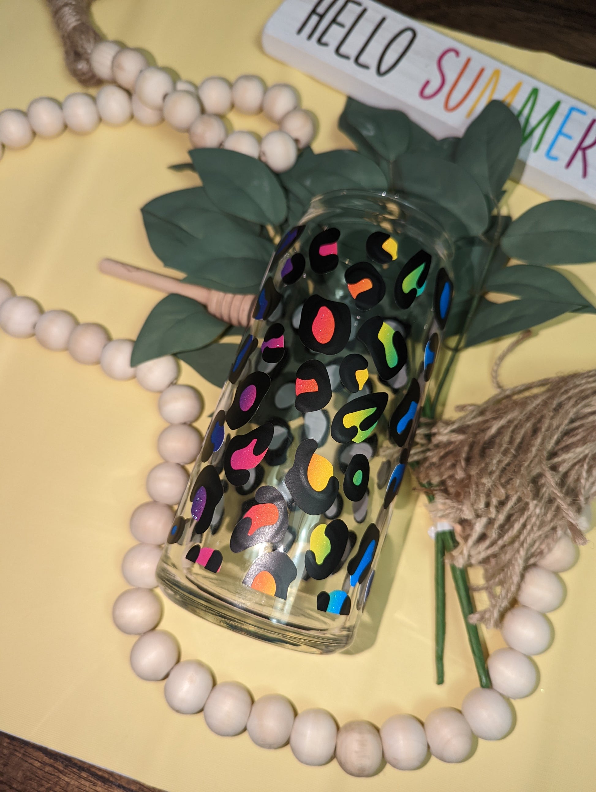 20 oz glass can comes with or without a bamboo lid and 2 glass straws. Completed with black and rainbow ombre vinyls