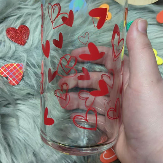 20oz glass can with or without a bamboo lid as well as 2 glass straws. COmpleted with a full wrapped design of hand drawn heart outlines and hearts.